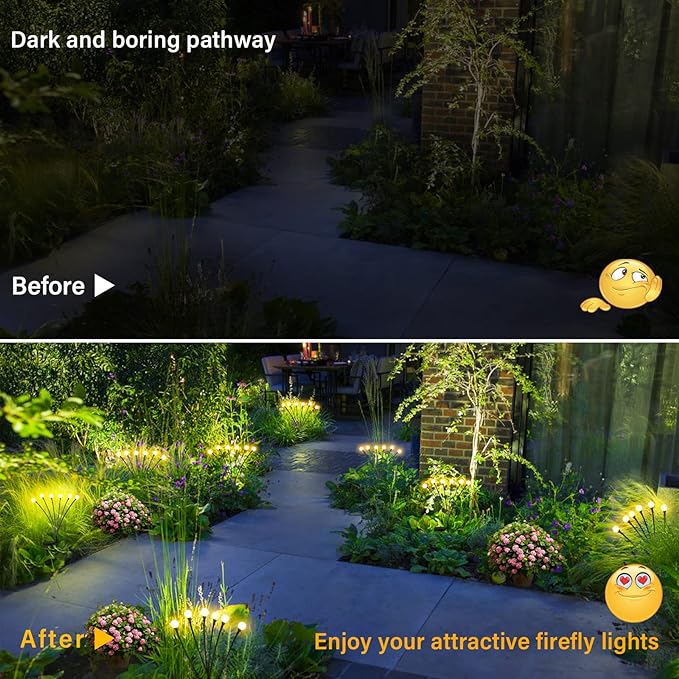 ✨【Durable Materials, All-Weather Fearless】- These solar powered firefly lights are equipped with superior copper and ABS, which is a totally upgrade. The solar panels are also well-sealed with IP65 waterproof technology. You could confidently leave these solar swaying lights outside in the hot summer, heavy rainy days, or snowy winter.